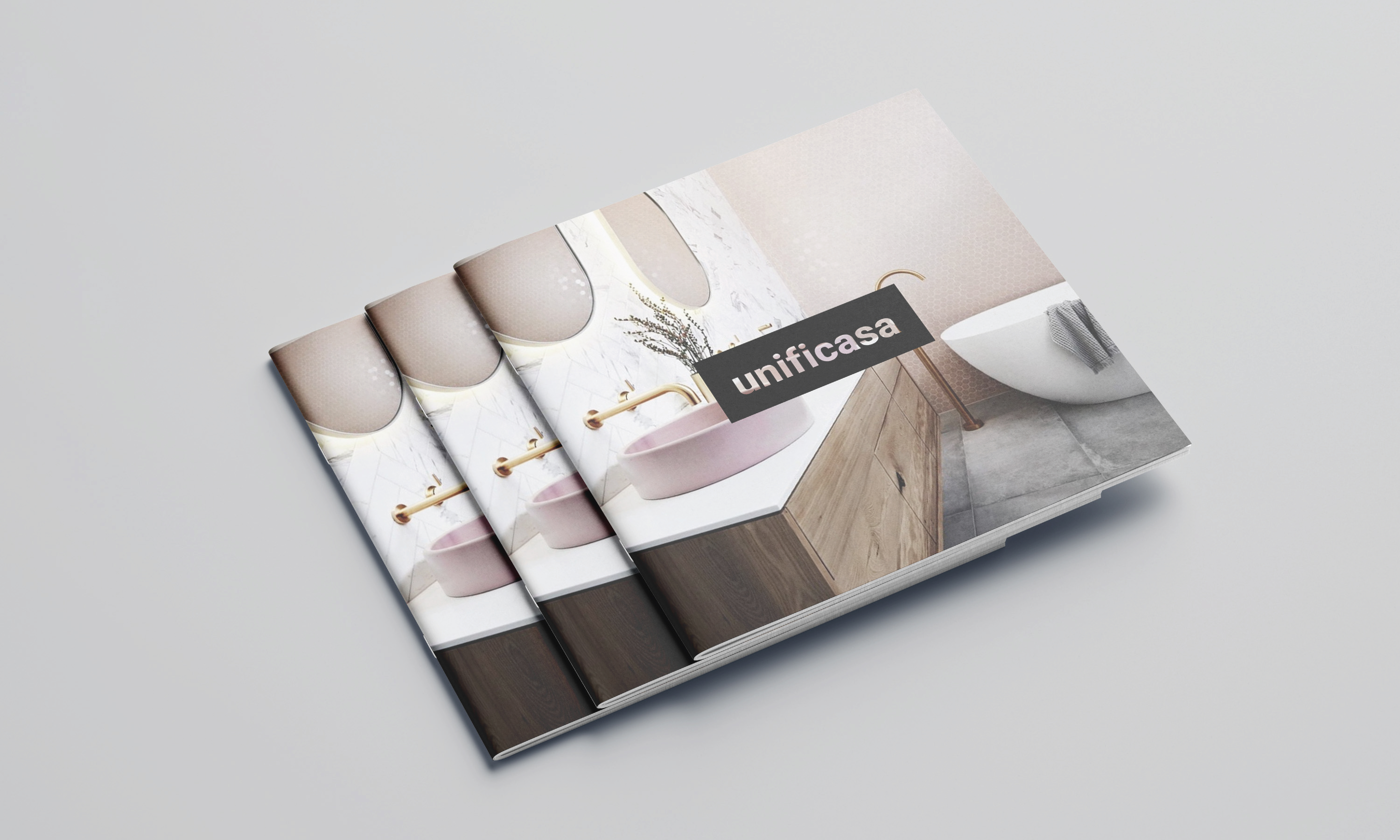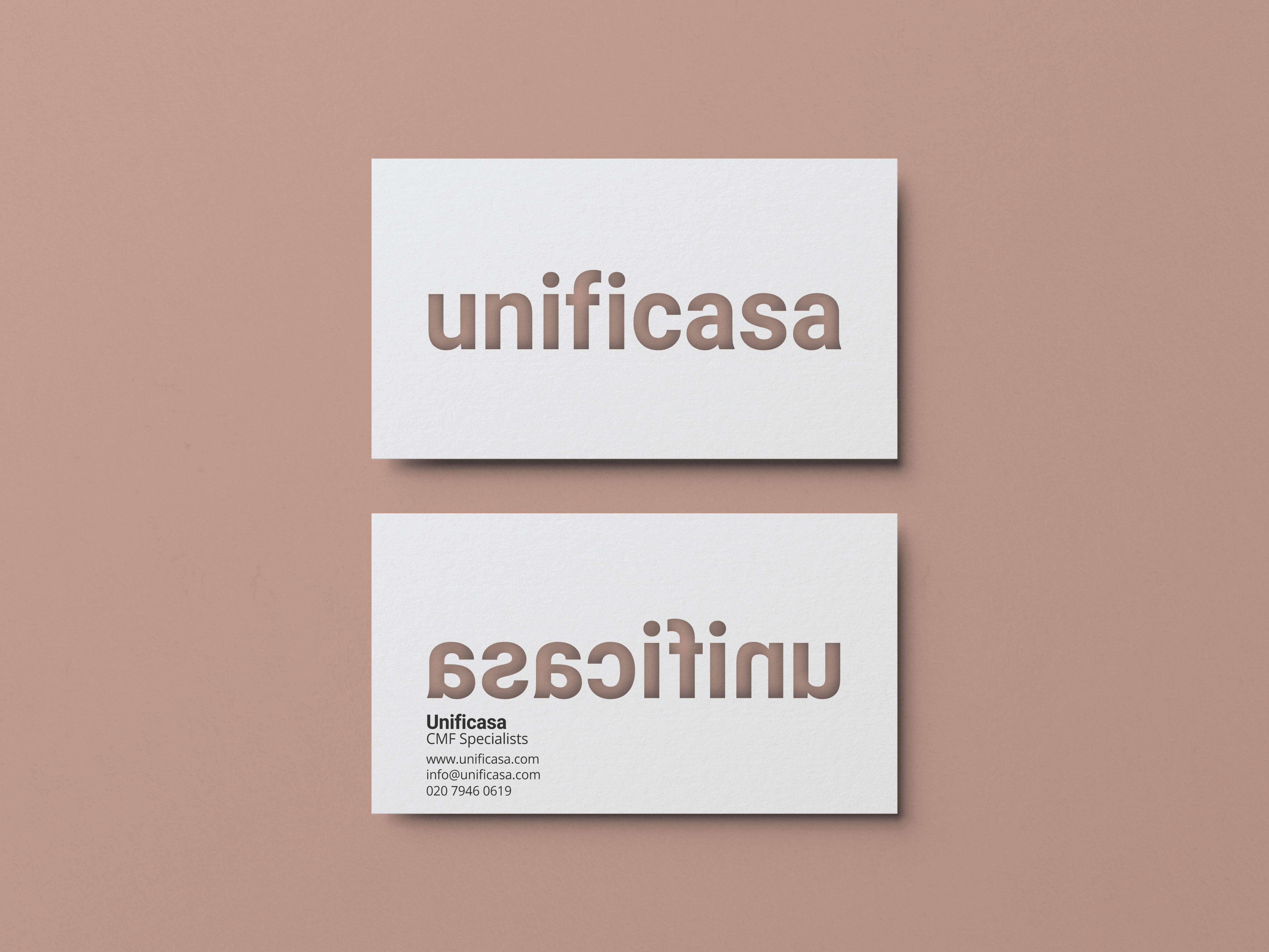 The name is a portmanteau of ‘unificata’ (unified) and ‘casa’ (home), keeping the brand’s Italian base focal whilst playfully explaining their USP. The logo was designed as a partly transparent ‘sticker’ element that allows their bold, cohesive design environments to be highlighted through it. This also allows for playful applications on business cards and other peripherals.
