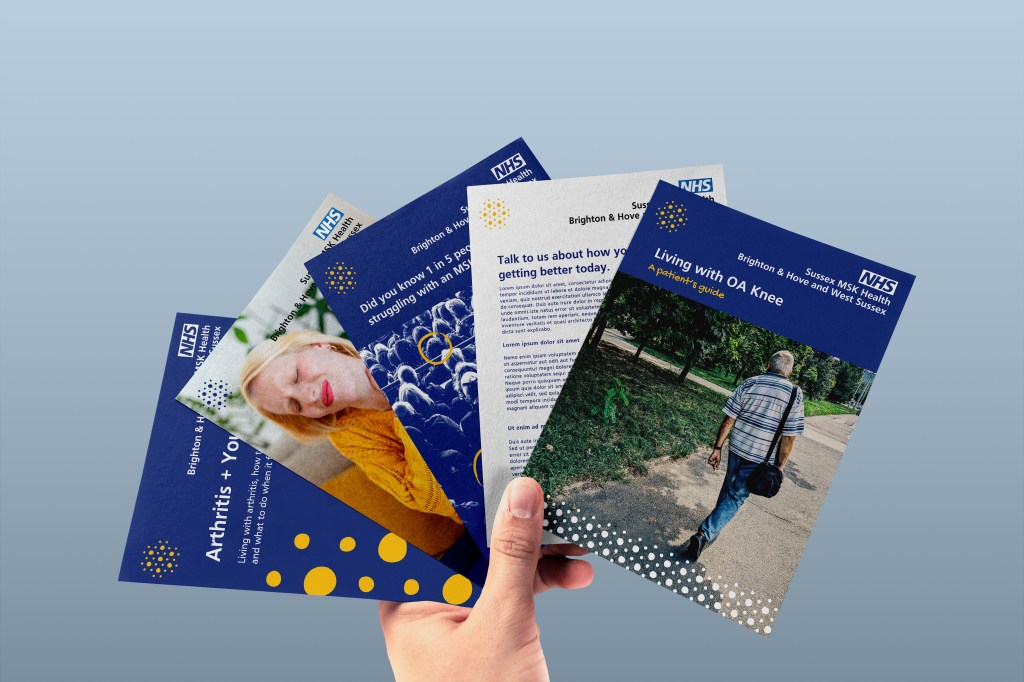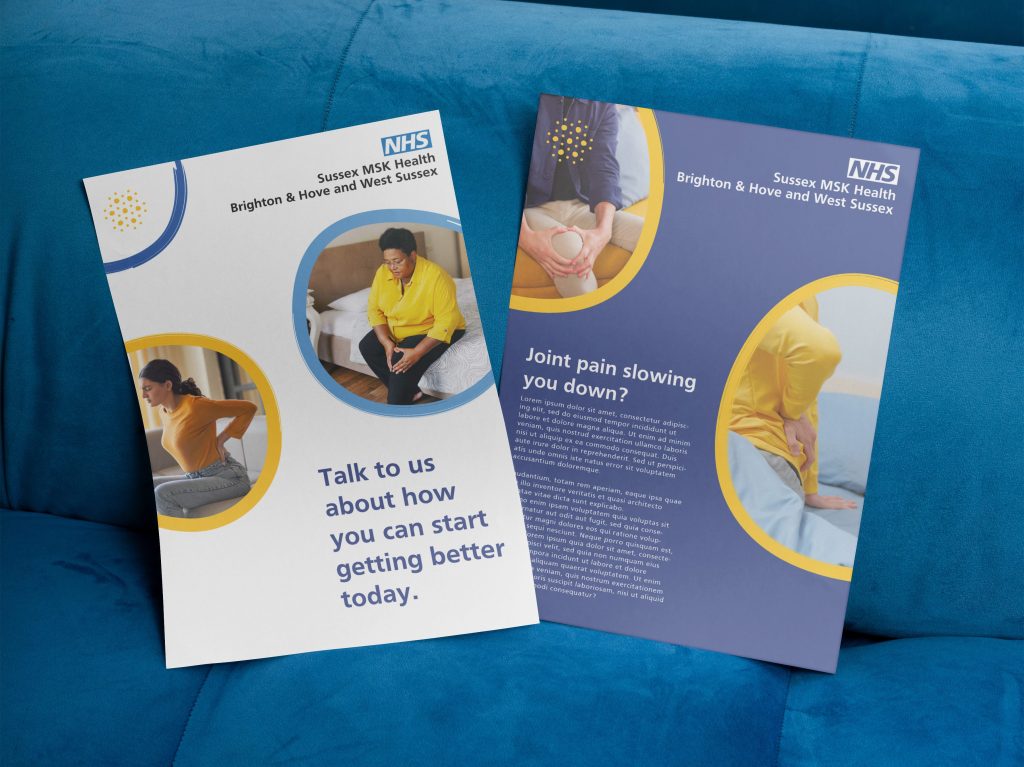 Sussex MSK Health was founded on the promise to provide patient centred, de-medicalised, personalised care with a focus on community outreach & public behaviour change. As a newly formed service, they needed a distinct brand identity (to support their ambitious community outreach work) whilst also following national NHS identity guidelines.